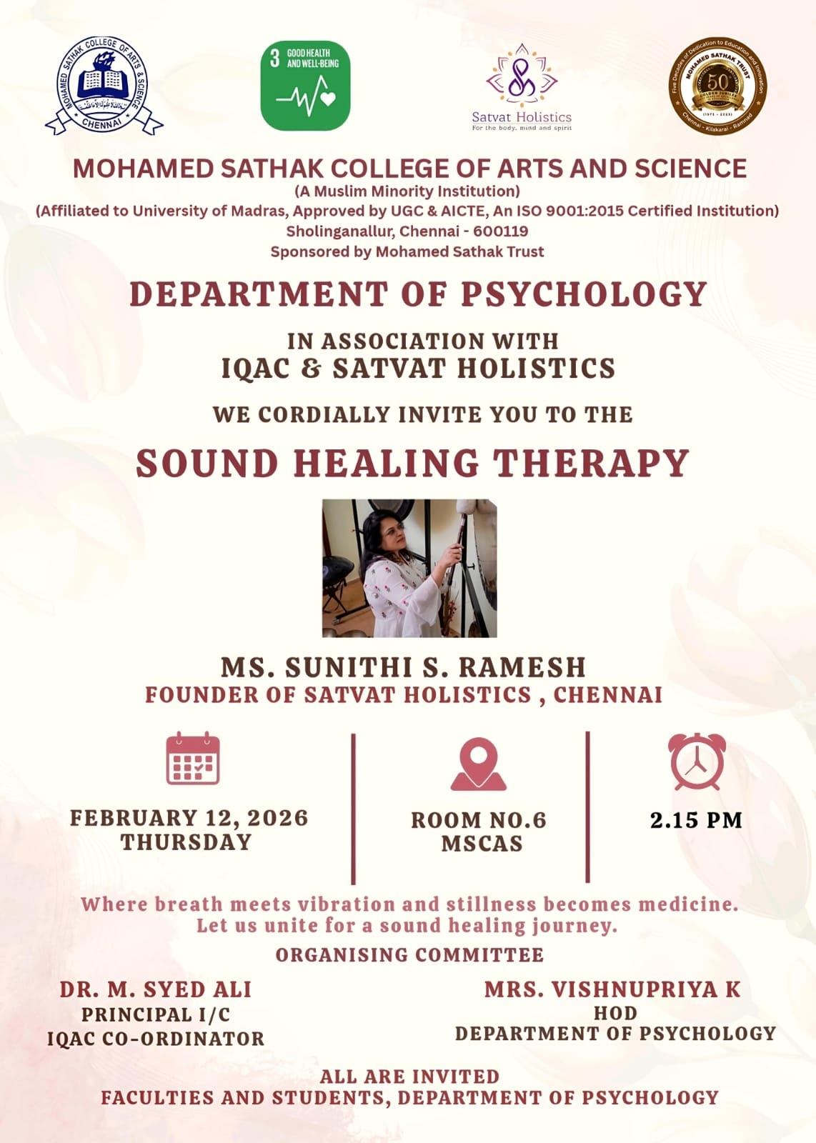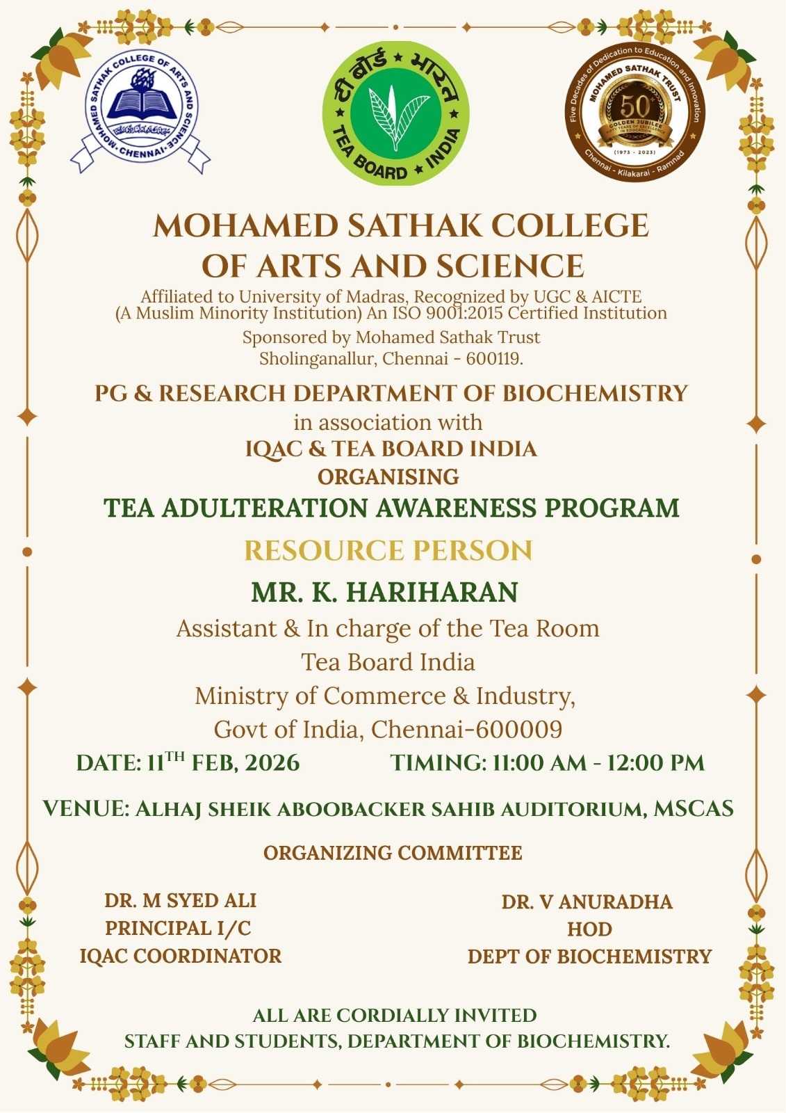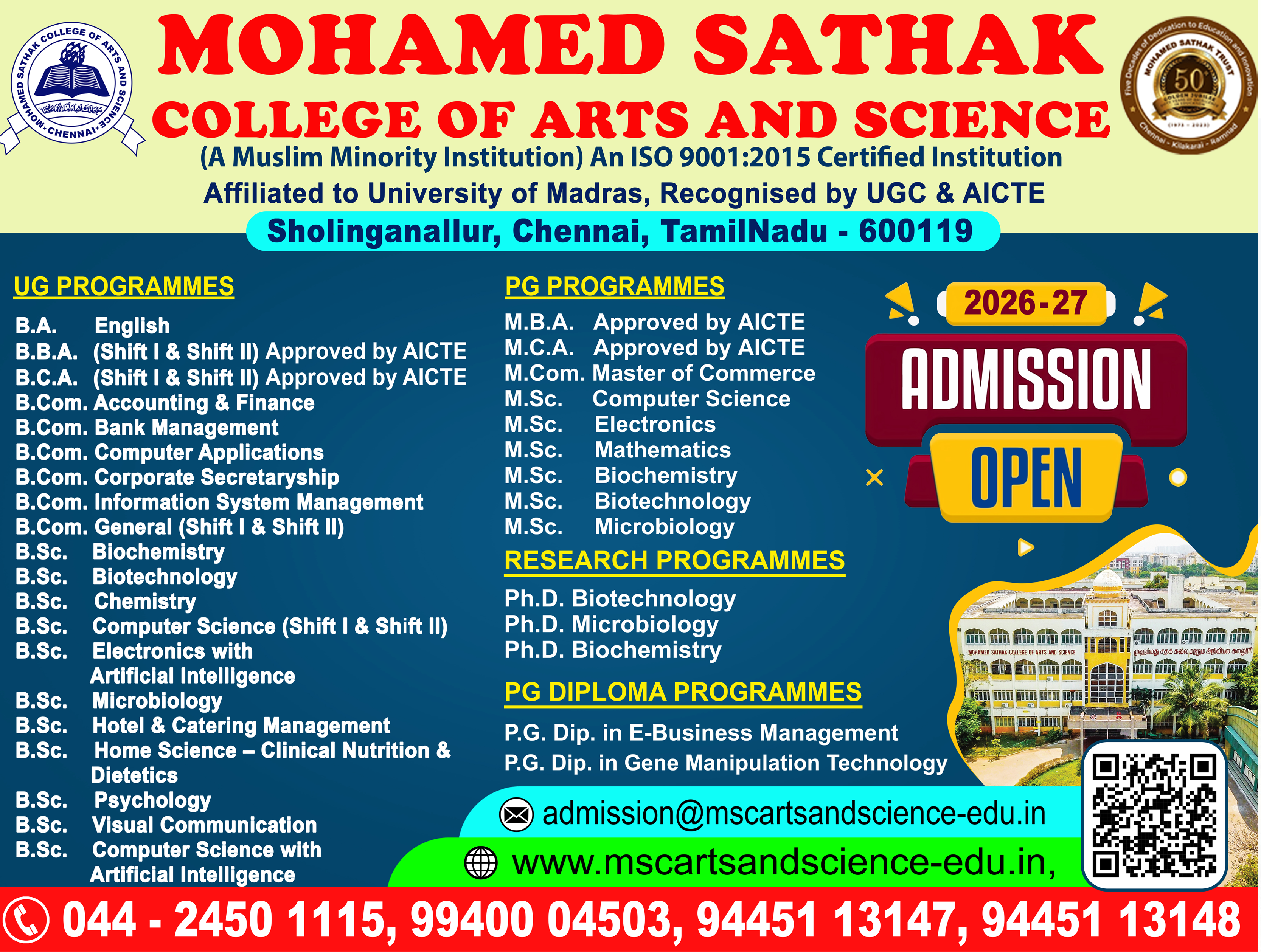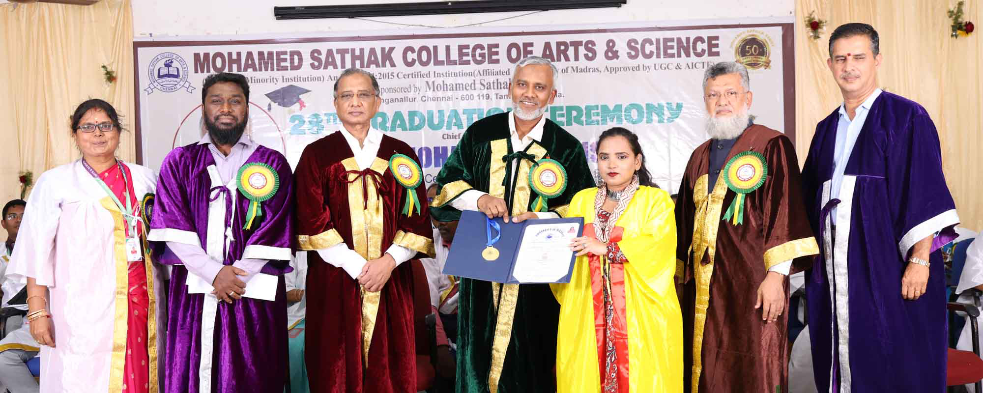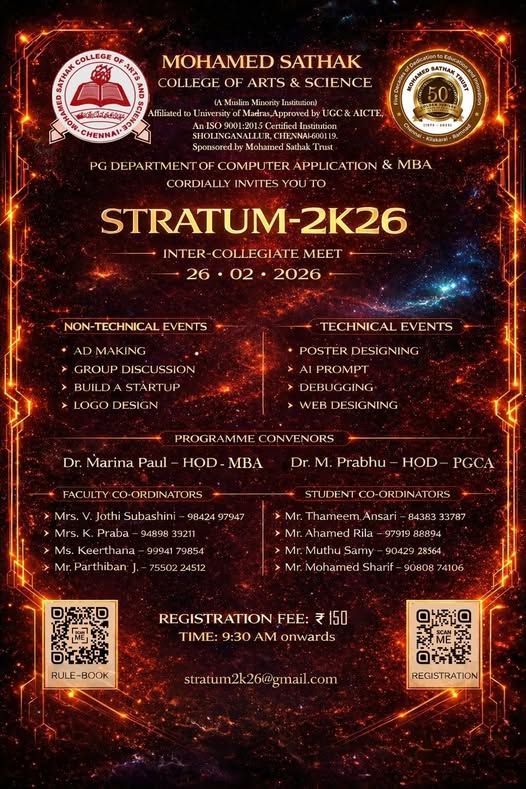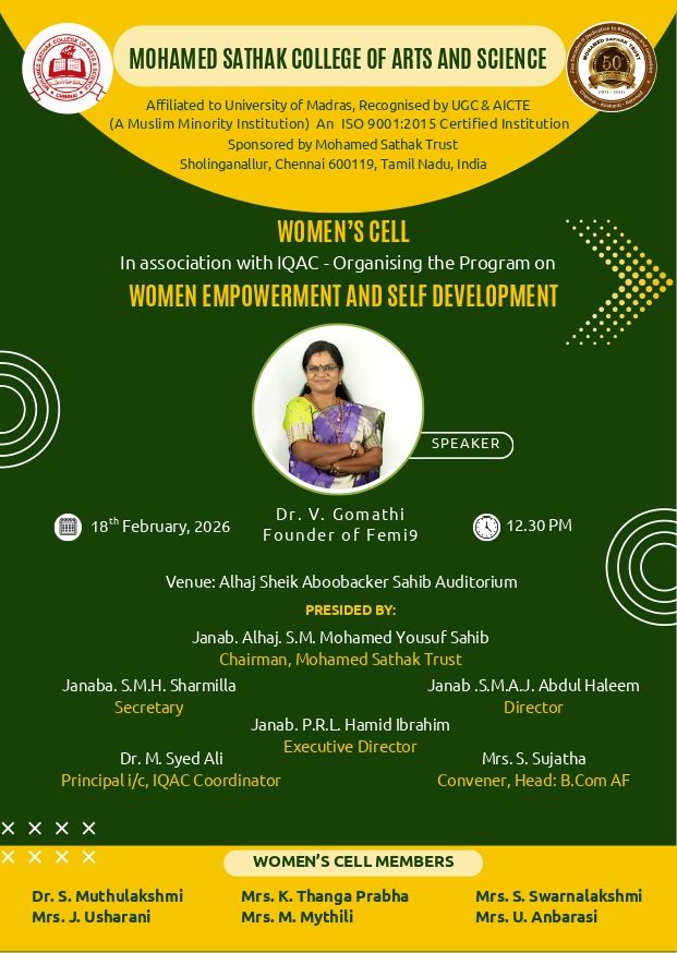 Academic Excellence: Founded in 1991 by the Mohamed Sathak Trust, Mohamed Sathak College of Arts & Science is a coeducational institution in Sholinganallur, Chennai, affiliated with the University of Madras and approved by the AICTE. Offering 19 undergraduate, 9 postgraduate, 2 diploma courses, and 6 research programs, the college is dedicated to educating its 3401 students. The curriculum enhances employability and equips students with the skills needed to tackle corporate challenges.