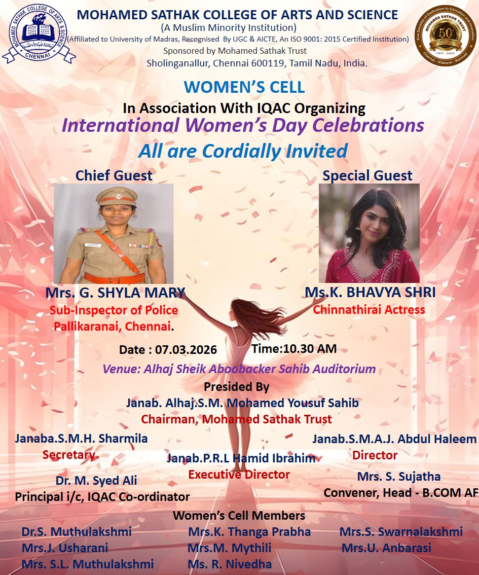Academic Excellence: Founded in 1991 by the Mohamed Sathak Trust, Mohamed Sathak College of Arts & Science is a coeducational institution in Sholinganallur, Chennai, affiliated with the University of Madras and approved by the AICTE. Offering 20 undergraduate, 9 postgraduate, 2 diploma courses, and 6 research programs, the college is dedicated to educating its 3401 students. The curriculum enhances employability and equips students with the skills needed to tackle corporate challenges.