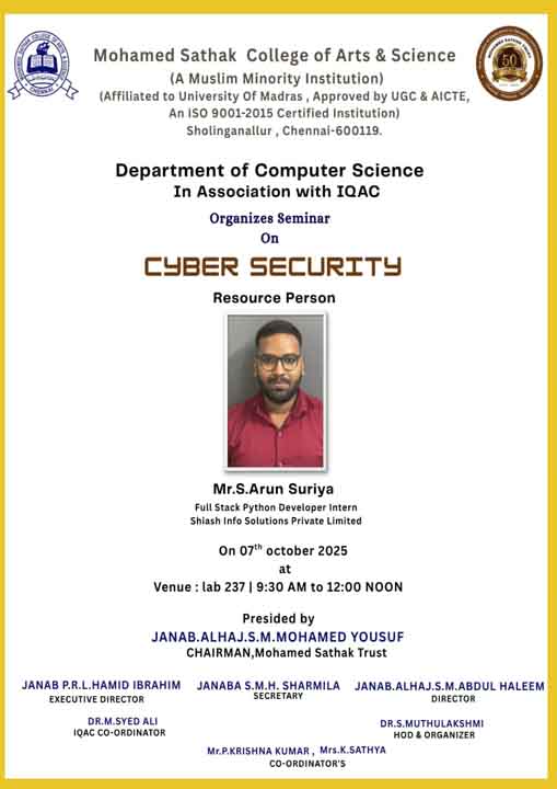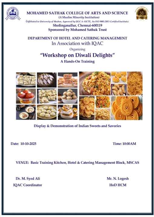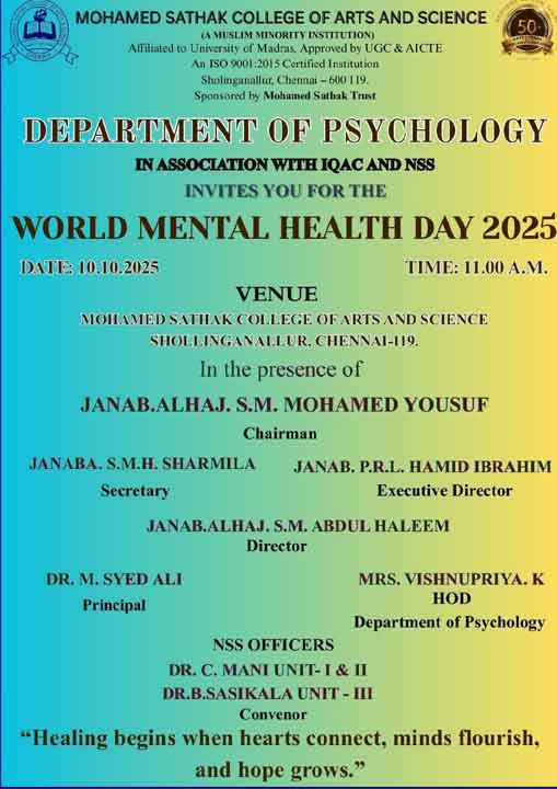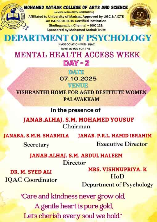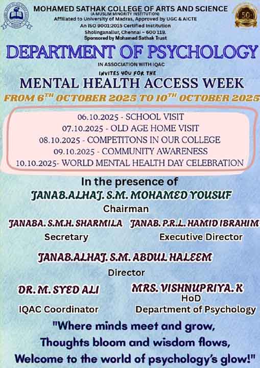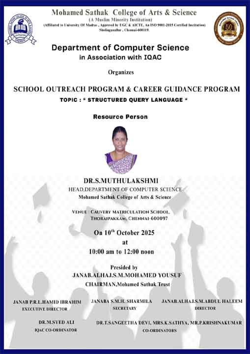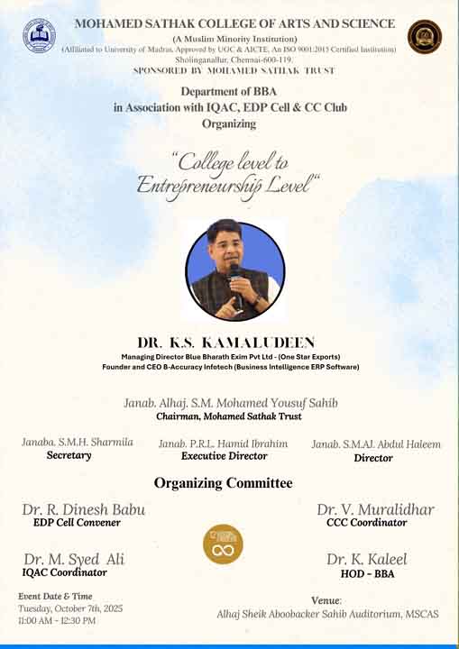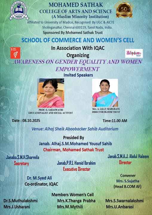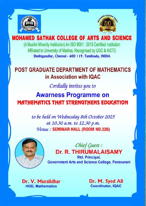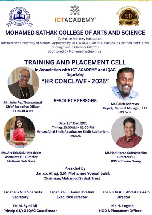 Academic Excellence: Founded in 1991 by the Mohamed Sathak Trust, Mohamed Sathak College of Arts & Science is a coeducational institution in Sholinganallur, Chennai, affiliated with the University of Madras and approved by the AICTE. Offering 19 undergraduate, 9 postgraduate, 2 diploma courses, and 6 research programs, the college is dedicated to educating its 3401 students. The curriculum enhances employability and equips students with the skills needed to tackle corporate challenges.