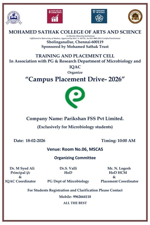 Academic Excellence: Founded in 1991 by the Mohamed Sathak Trust, Mohamed Sathak College of Arts & Science is a coeducational institution in Sholinganallur, Chennai, affiliated with the University of Madras and approved by the AICTE. Offering 19 undergraduate, 9 postgraduate, 2 diploma courses, and 6 research programs, the college is dedicated to educating its 3401 students. The curriculum enhances employability and equips students with the skills needed to tackle corporate challenges.